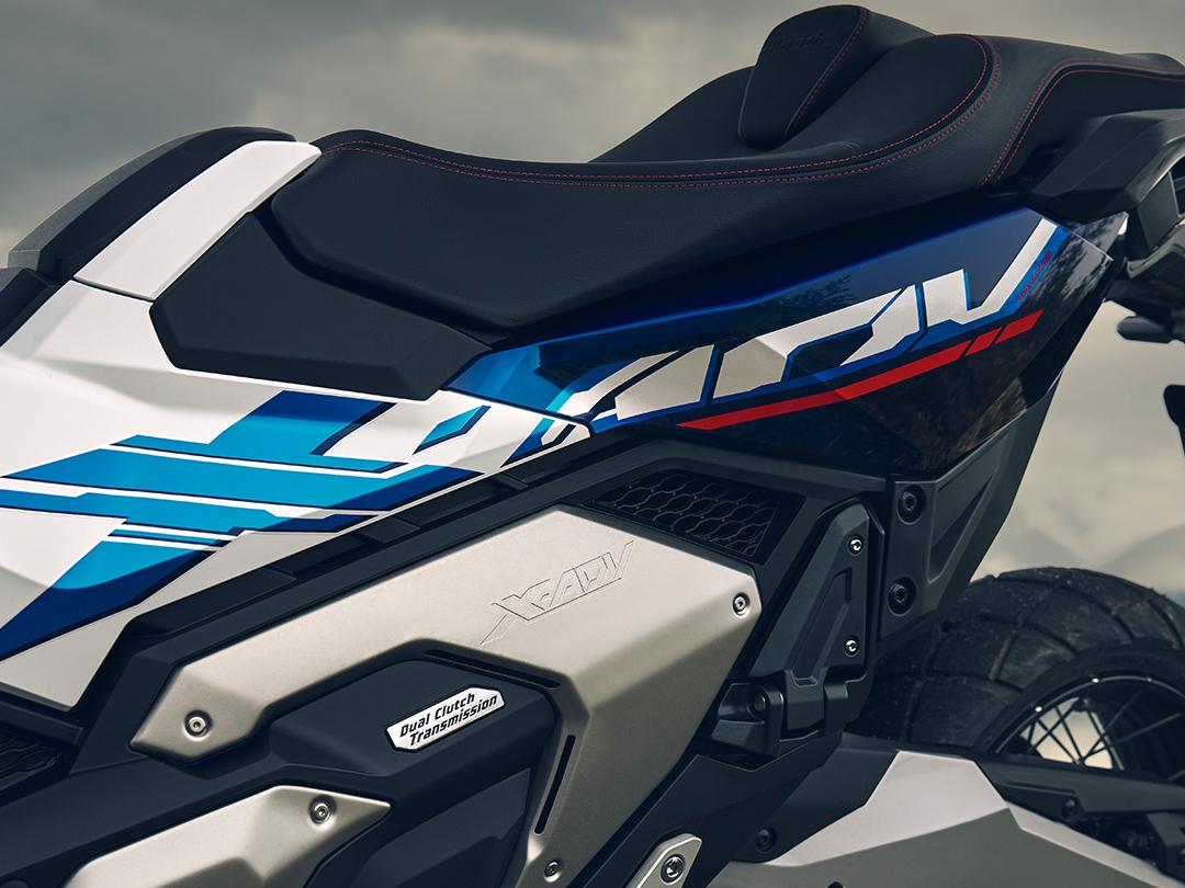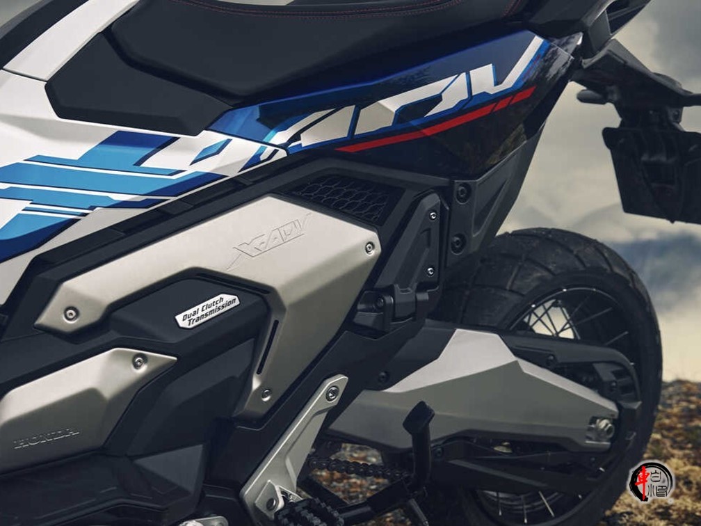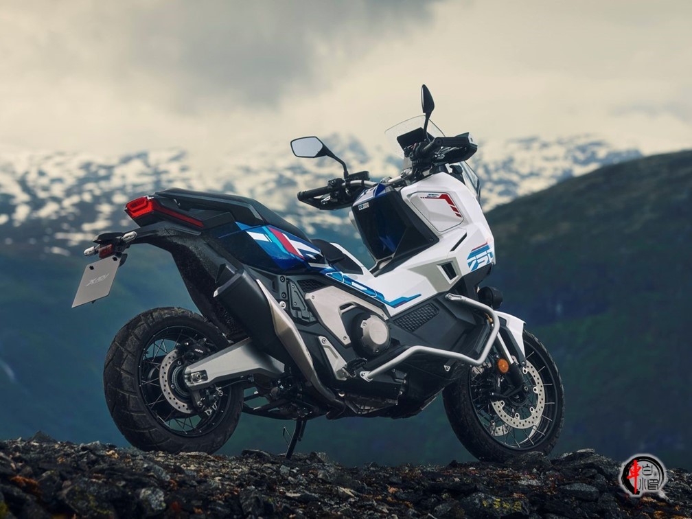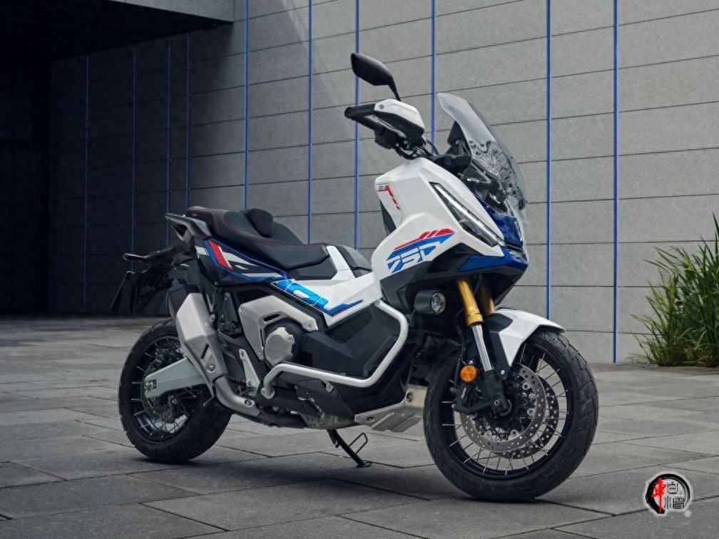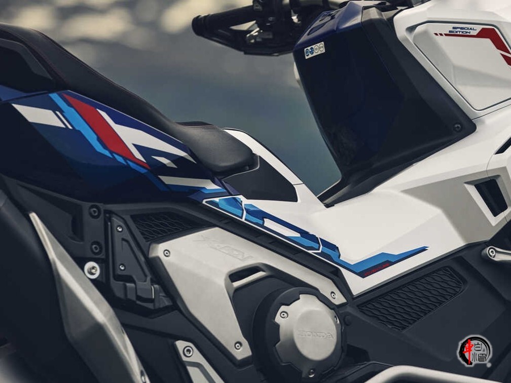 特别版的灵魂在于涂装。哑光珍珠白的底色上,红、蓝双色拉花从车头凌厉地贯穿至车尾,这种源自本田旗舰ADV车型的经典配色方案,瞬间将它从普通都市踏板中剥离出来,赋予了强烈的冒险家族辨识度。金色前叉护套、立体的“HONDA”浮雕标志是精致的点缀。整体轮廓保持了X-ADV标志性的高挑姿态,看起来就不太好惹的样子。