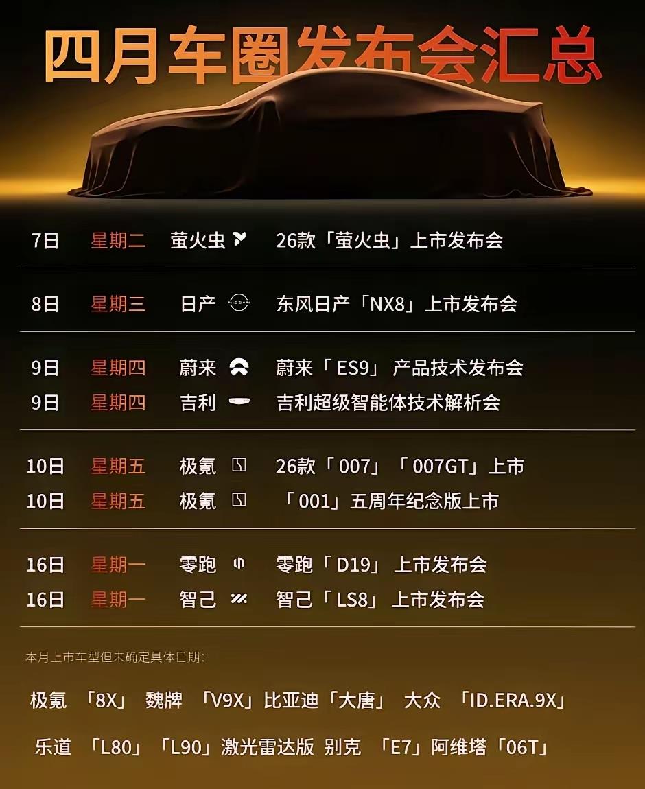 你猜怎么着?就在前几天,零跑汽车刚以50029辆的销量拿下了3月份新势力销冠,把理想、蔚来都甩在了身后。可这热乎劲儿还没过,4月份的车市就直接炸了锅——蔚来一口气推出4款新车,比亚迪带着“大唐”杀入全尺寸SUV战场,零跑自己也没闲着,马上要发布D19这款“价格屠夫”。有人说3月销量回暖是“车市寒冬已过”,但看看4月这阵仗,这哪是回暖,分明是各家车企要把对方往死里卷啊!今天咱们就来盘盘,4月份到底有哪些狠货要上市,你的钱包准备好了吗?