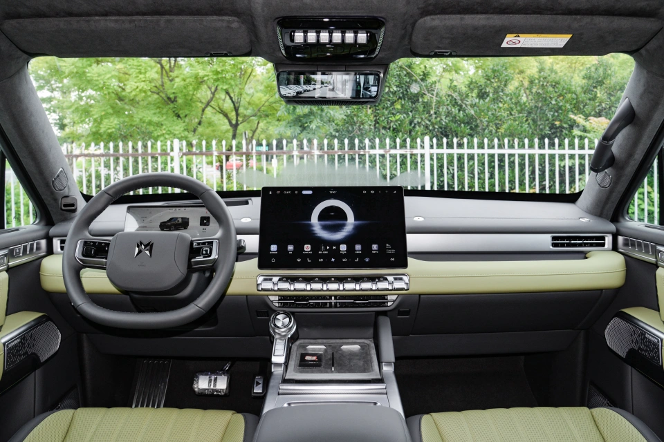 这款车最引人注目的特点在于其将硬派越野能力与前沿智能科技进行了深度融合。动力系统搭载1.5T发动机与电动机组成的插电混动系统,综合功率高达505千瓦,综合扭矩848牛·米,零百加速仅需4.8秒。高配车型搭载50.4千瓦时电池组,CLTC纯电续航达215公里,综合续航达1200公里,完美兼顾了日常通勤的经济性与长途穿越的续航保障。