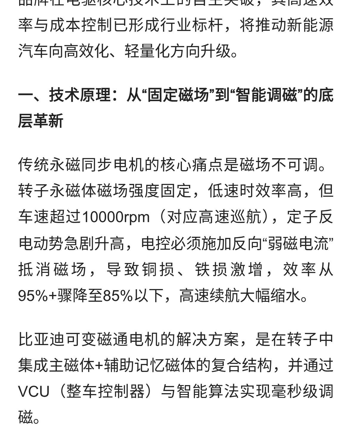 比亚迪这次换的招儿,挺巧的。他们没再让电机一直硬扛着,而是在转子里面塞了一套能活动的导磁机构,相当于给电机装了个“智能变速箱”。怎么个智能法呢?你低速起步、急加速、爬坡的时候,它自动切到“强磁模式”,磁场拉满,扭矩直接提升30%,开起来跟3.0T燃油车似的,一脚下去推背感就来了。等你车速稳在120巡航了,它立马切到“弱磁模式”,把磁场强度降下来,反电动势大幅削弱,电机不需要再额外耗电去对抗阻力了。