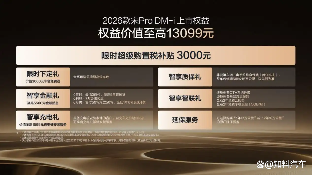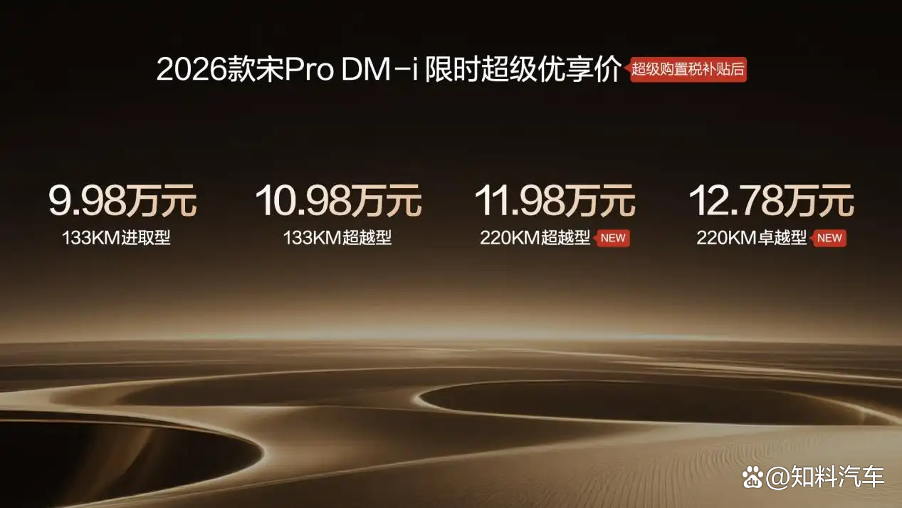 2026年1月10日,比亚迪正式宣布2026款宋Pro DM-i上新220km长续航版本,全系限时超级优享价9.98-12.78万元。