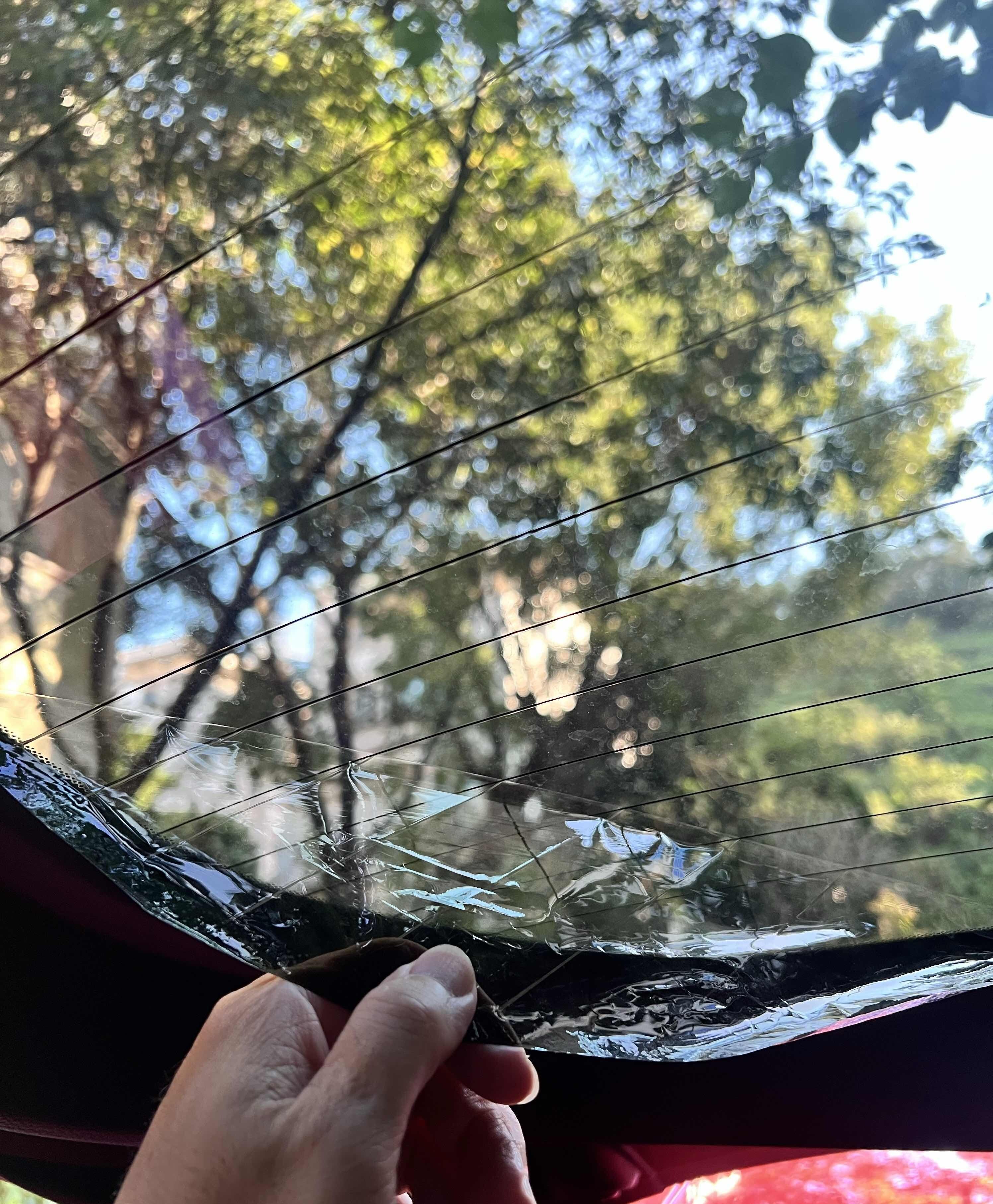 决定是做了,但我心里其实挺忐忑的。不是因为心疼钱,刚贴没几天就撕确实有点肉疼,但更让我担心的是后挡风。老司机应该都知道,后挡风玻璃上有一条一条的横线,那是加热丝,用来除雾除霜的。这玩意儿特别娇气,撕膜的时候如果操作不当,很容易把加热丝涂层一起扯下来。网上搜一下就知道了,一堆人哭诉换后挡膜把加热丝弄坏了,后窗除雾功能报废,修都没法修。有的甚至不是加热丝被扯断,而是劣质膜的胶层不稳定,时间久了胶和膜分离,胶粘在加热丝涂层上,除胶的时候涂层跟着掉了。