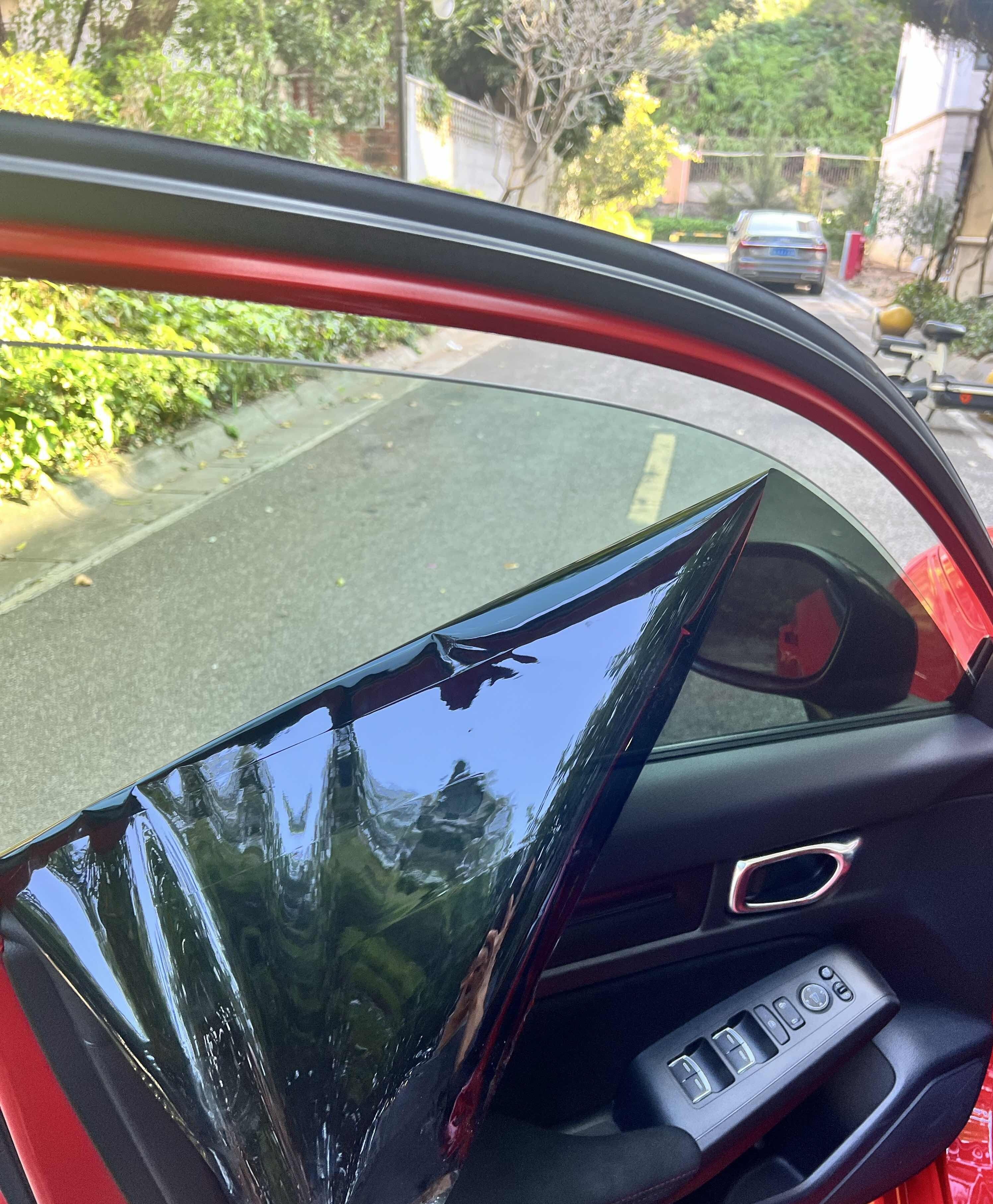 前窗和侧窗的膜就更容易了,因为贴的时间确实短,胶还没完全固化,揭下来的时候几乎没有留胶。师傅用清洁剂擦了一遍玻璃,干干净净,跟没贴过一样。