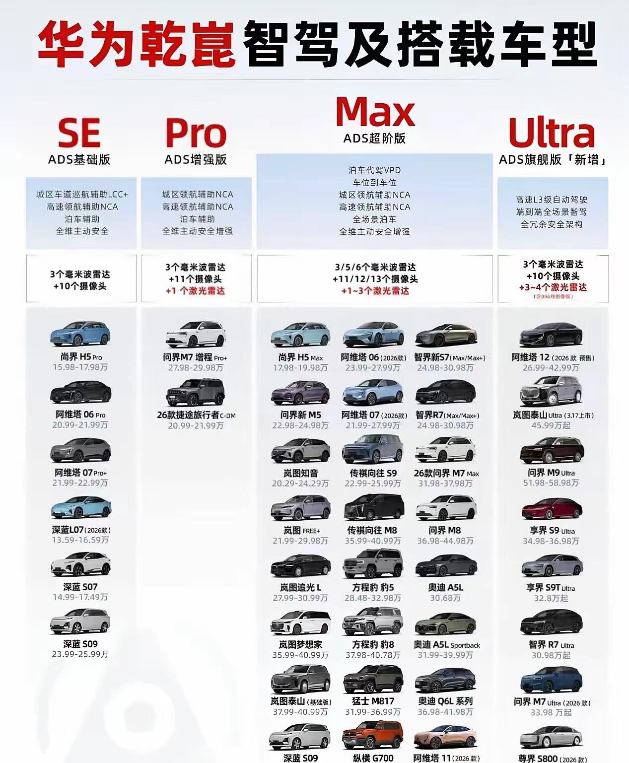 2026年的今天,华为乾崑智驾已经铺满了从十几万到上百万的车型,深蓝L07优惠后只要13.59万起,尊界S800顶配能干到101.8万。但问题是——你真的分得清SE、Pro、Max、Ultra这四个版本的区别吗?