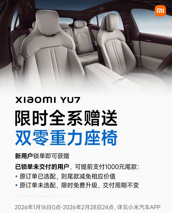 为了配合这波攻势,小米直接给YU7全系送双零重力座椅。