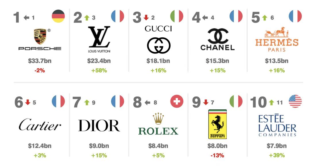 在2023年的时候,保时捷更是力压我们熟知的一众知名奢侈品牌,成为世界最有价值的奢侈品。同时也是榜单前三中,唯一的车企。