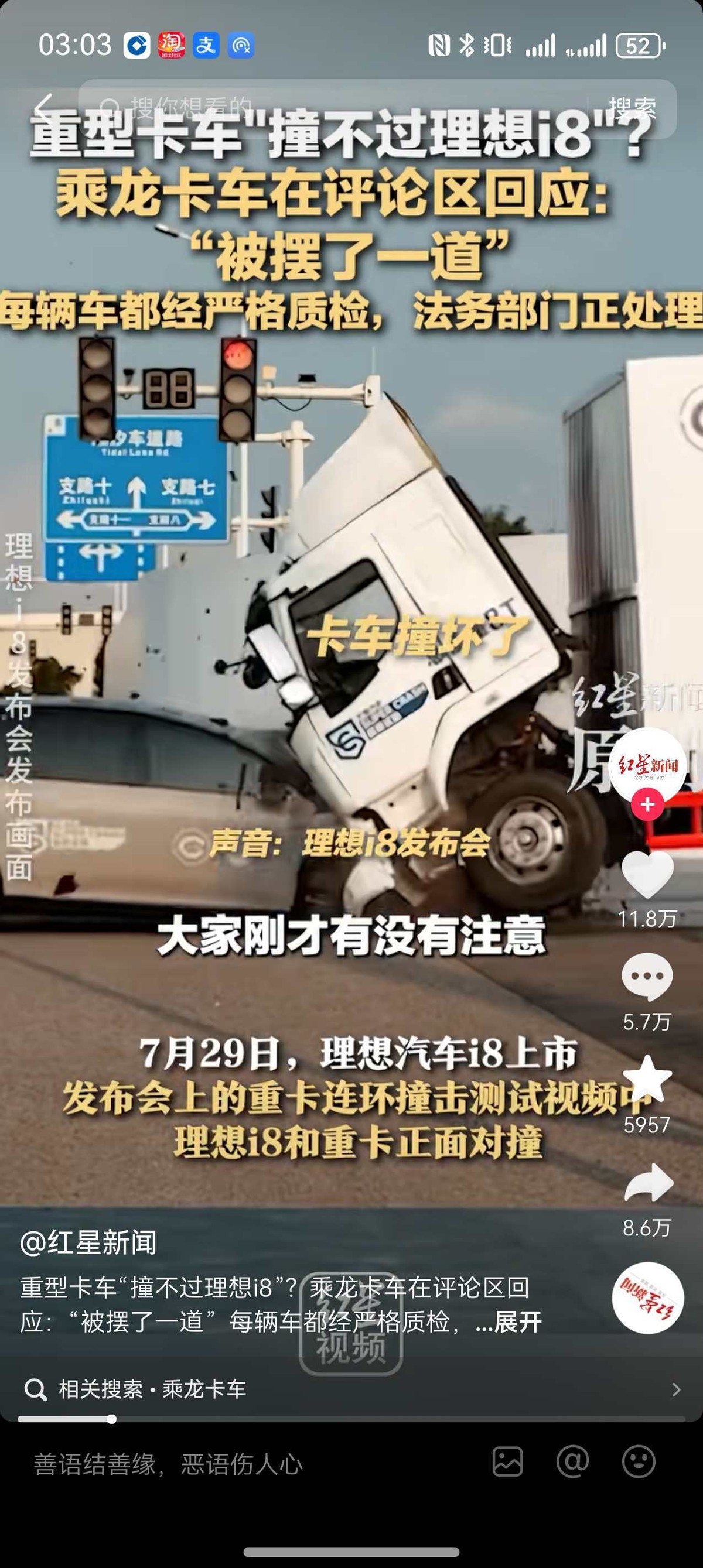 在视频中一辆理想I8把一辆8吨重的大卡车给撞飞了。这条视频在网络上引起了巨大的讨论,有眼见的网友发现,被撞的这辆重卡是东风柳汽的乘龙大卡车。