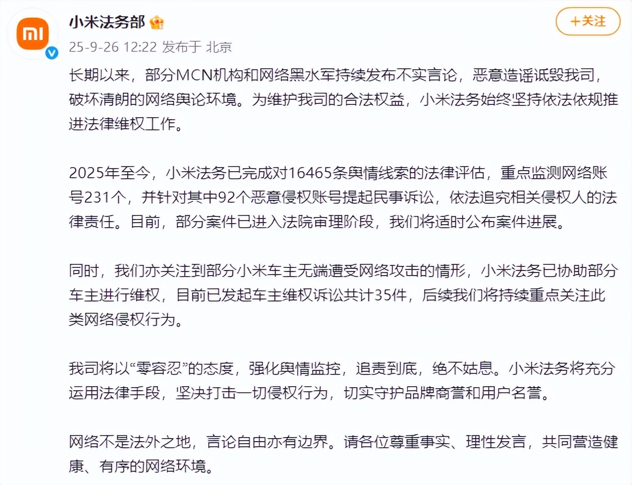 据小米法务部表示,自从2024年底以来,公司就出现了不少黑公关事件,水军利用AI生成各种不实信息,并且大多都是在新车发布期间集体发通稿抹黑。