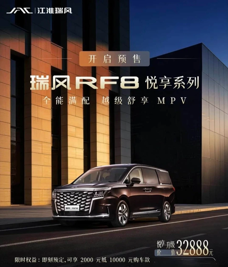 瑞风RF8悦享系列已开启预售,预定可享2000元抵10000元福利,定位高端中大型MPV,气场不输丰田埃尔法,提供燃油版和混动版,搭载2.0T+8AT动力,剑指传祺M8、别克GL8,性价比拉满。
