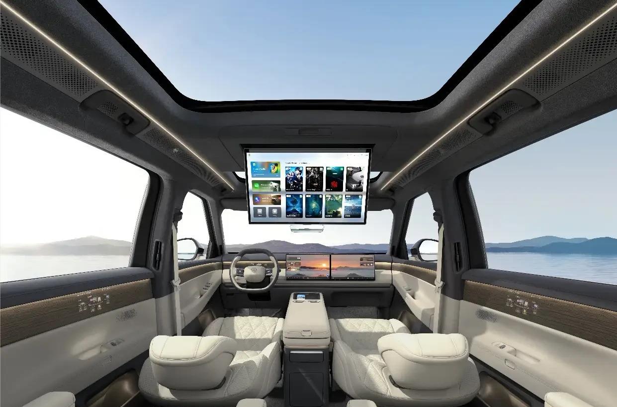座舱方面,九屏联动。前排15.6英寸双联屏,后排21.4英寸吸顶屏,还有那骚气的“Smart Surface魔术屏”——平时看着就是木纹饰板,需要时才显示信息。