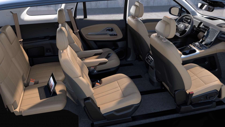 等开上高速,他媳妇和孩子可就享福了。他闺女直接在半躺的副驾女王座椅上睡着了,带加热通风按摩,还能一键舒展成接近平躺的模式。第二排是两个独立的航空座椅,他老婆和丈母娘坐着,一个用折叠桌板处理邮件,一个戴着耳机通过头枕音响看剧,互不打扰。我坐在第三排,空间比想象中宽敞不少,长途也不会憋屈。整个车厢安静得只有细微的背景音乐,他儿子甚至用后舱娱乐屏完成了半套线上作业。这哪是坐车,分明是把家里的客厅、书房、影音室全搬上了路。
