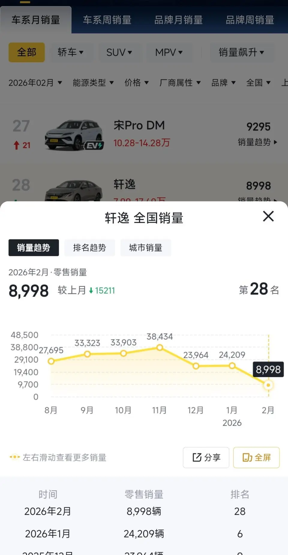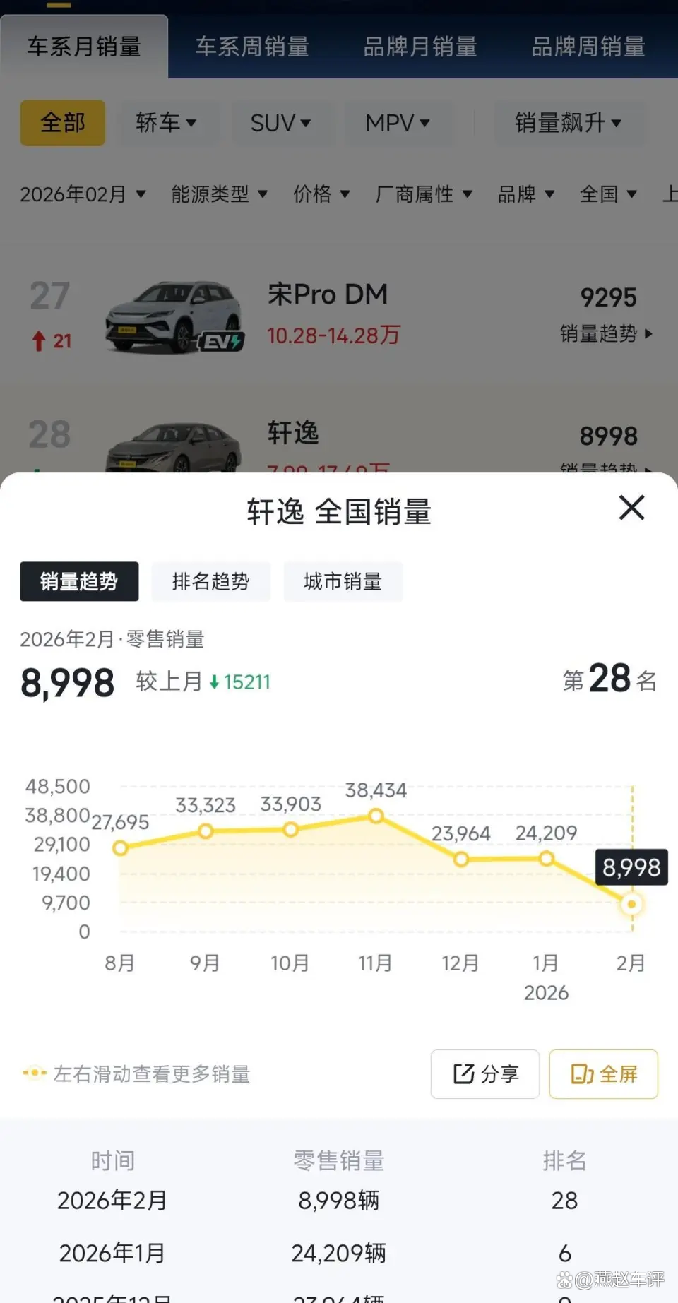 先看最真实的2月销量。据乘联分会数据,2026年2月东风日产(含英菲尼迪、启辰)销量16012辆,同比下滑19.5%,不仅近乎“腰斩”,更创下近9年最差纪录。更扎心的是,曾扛着品牌七八年的轩逸也撑不住了——2月燃油轿车销量榜中,轩逸以8998辆罕见跌出前十。要知道,轩逸长期占东风日产总销量53%左右,2025年全年卖出32万辆,是名副其实的“全村的希望”,如今这根独苗蔫了,东风日产的根基已然松动。