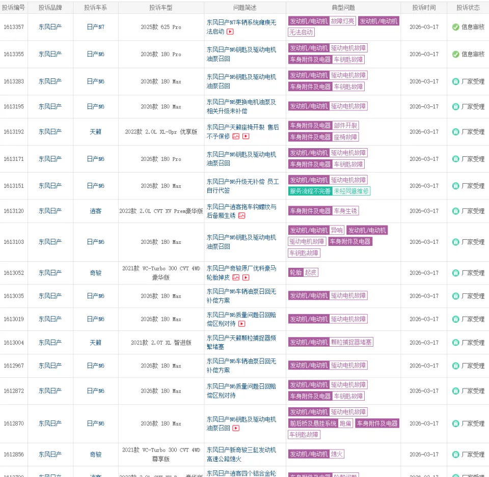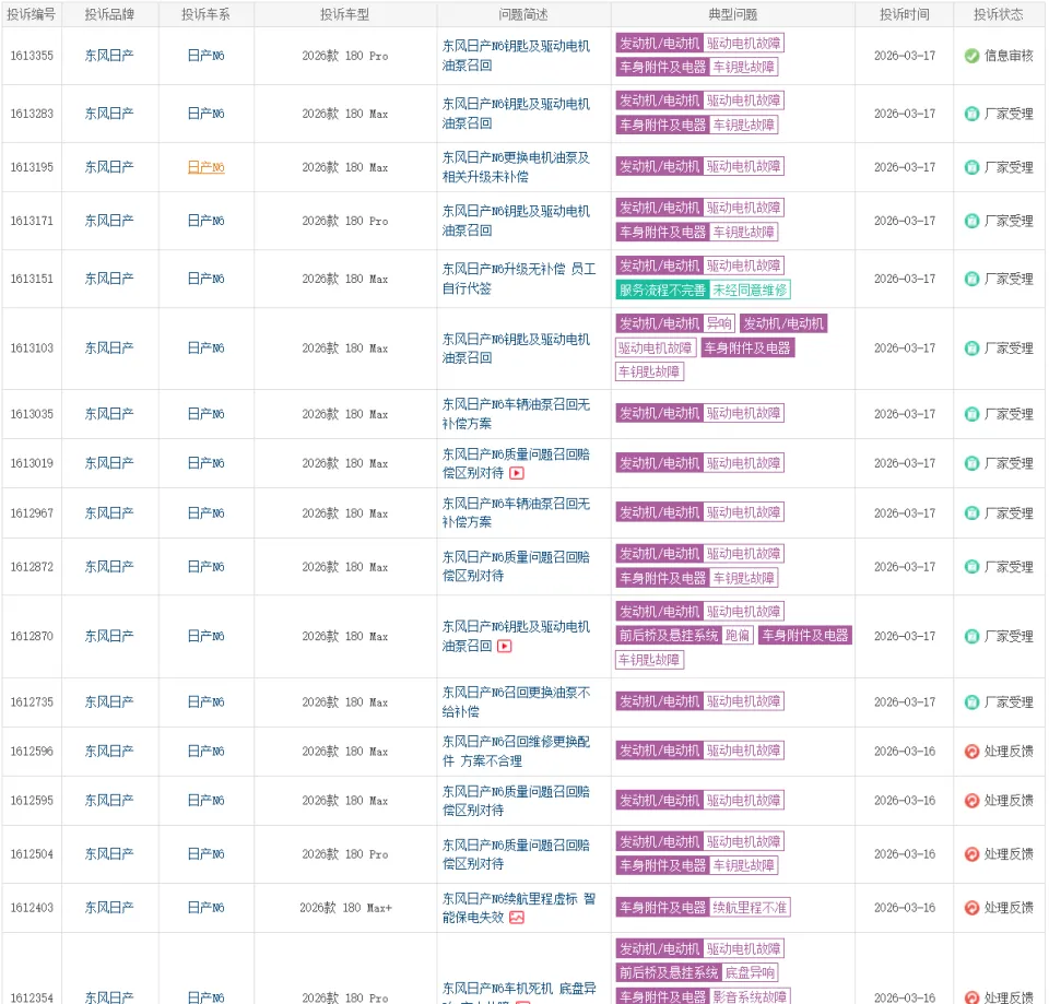 再看N6。这款2025年12月上市的新车,不到三个月就陷入投诉泥潭。有车主反映,提车三个月被通知回店四次,涉及智能钥匙失灵、驱动电机油泵更换、车机黑屏、强制保电失效等问题。更离谱的是东风日产的处理方式:部分车主拿到1-2万“关怀补贴”,有的却未收到任何通知;有的APP显示“召回”,有的显示“维修备件”,厂家客服甚至直言“没有召回”。