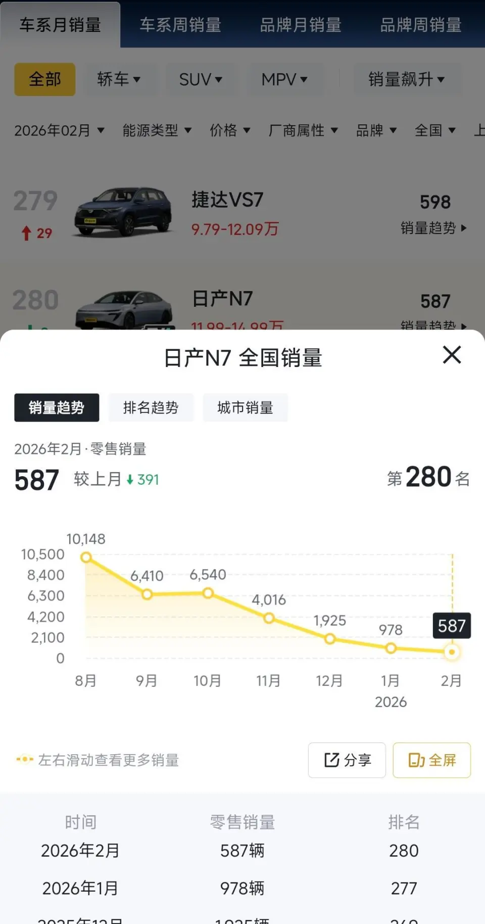 更致命的是,“拿来主义”还引发了内部内耗。N6与N7就是典型:定位高度重叠、价格交叉,N6比N7便宜近3万,上市后直接截胡N7客户。2026年2月,N7销量跌至587辆,N6也仅1861辆,这种“兄弟相残”,暴露了东风日产产品规划的短视与混乱。