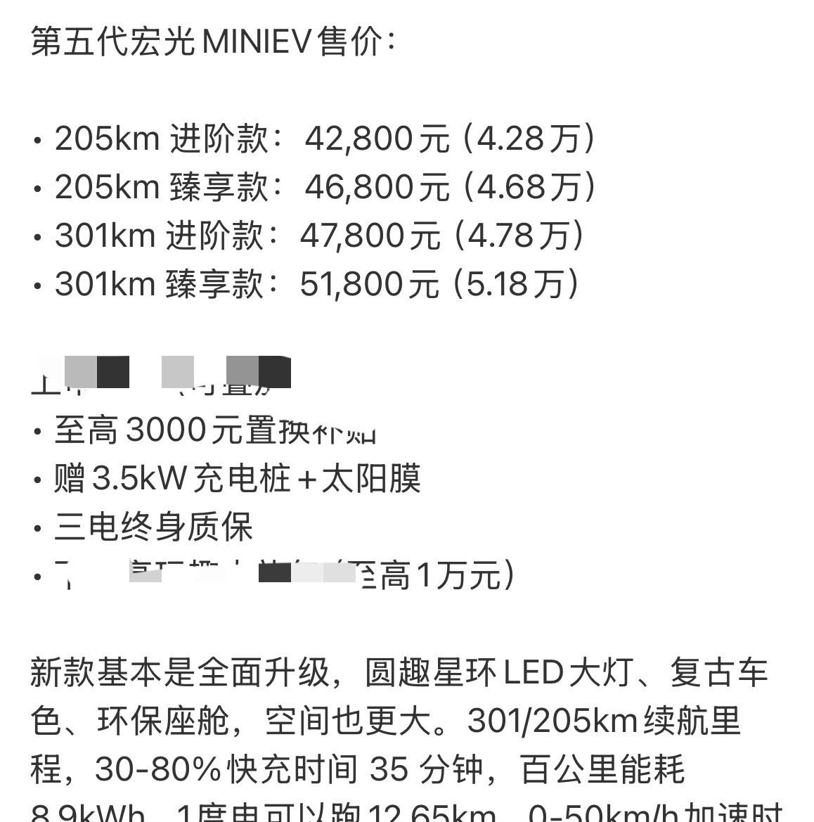 再说续航和充电。第五代给了两个版本,205km和301km。这数字看起来没多夸张,但它支持直流快充了,35分钟能从30%充到80%。以前宏光MINIEV被骂得最狠的就是没有快充,充个电要五六个小时,家里没充电桩的基本告别这车。现在有了快充,你逛个商场、吃个饭,出来电量就差不多满了。百公里电耗8.9kW·h,一度电能跑12.65km,一周一充,日常通勤够用。五菱没去堆什么五六百公里的续航,那是给跑长途用的,这车就是城市里转悠,够用就行。