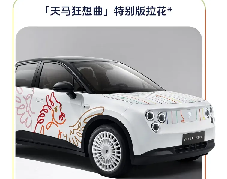 先端详这幅“画”最吸睛的“笔触”。它通体白色打底,但引擎盖、车侧和车顶,被荷兰艺术家用斑斓的彩色线条肆意涂抹,核心图案是一匹带翅膀的天马。这设计,跟市面上所有追求科技感或运动感的小车彻底划清了界限。开它上路,收获的注目礼肯定远超一台普通的代步车。它就像一件潮流艺术单品,直接把个性值拉满。对比同价位的比亚迪海鸥、五菱缤果,那些车是乖巧实用的“优等生”,而萤火虫特别版,则是个性张扬的“艺术生”,走的根本不是一条道。