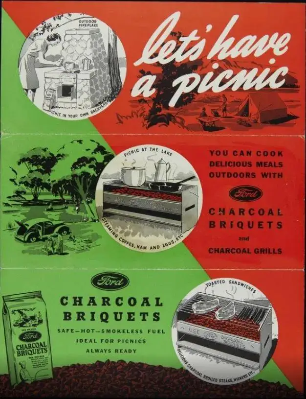 1930年代的美国,随着汽车和道路的普及,开车出行已是常态。福特针对有车一族,开始推销包含木炭、便携式烧烤架组成的“野餐套装”,包装盒上的广告语:“享用现代野餐吧——滋滋作响的烤肉,热腾腾的咖啡和烤三明治。”正是那时人们驾车外出野餐的真实写照。