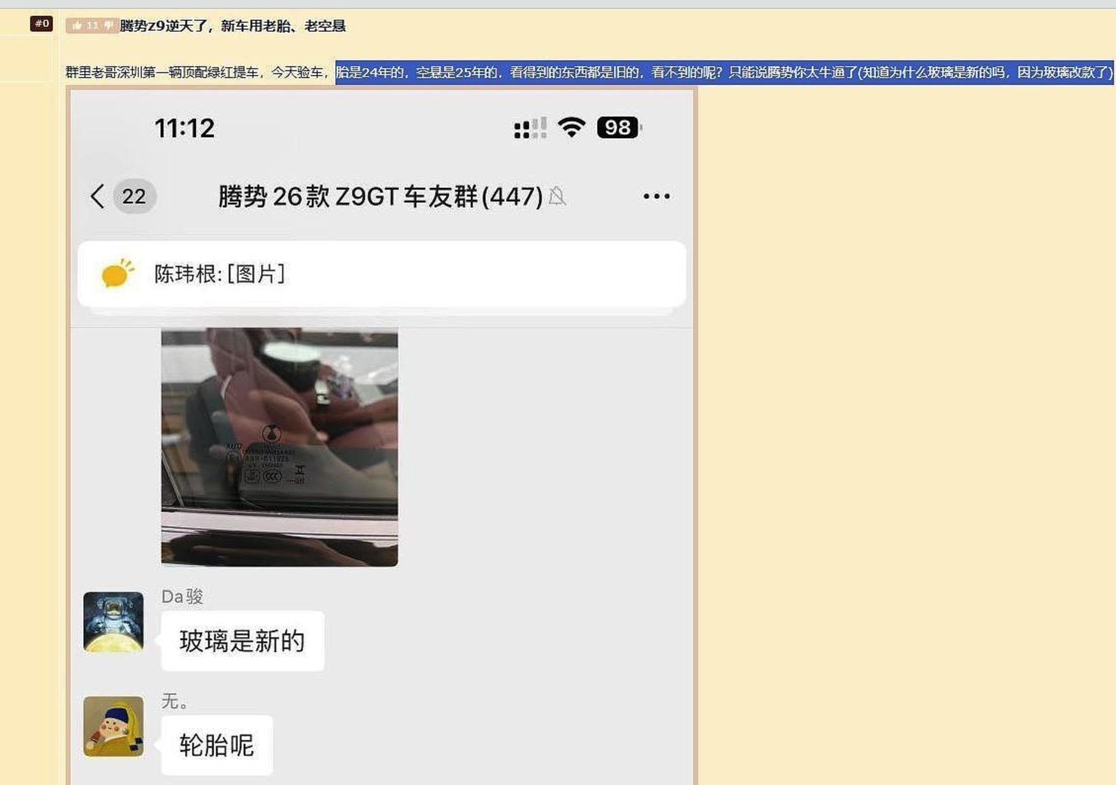 事情是这样的。有个车主刚提了腾势Z9新车,结果发现轮胎是去年生产的,空气悬挂也是去年的库存件。这事一传出来,网上直接炸锅了。有网友调侃说:“腾势这回没人喷我背刺老车主了吧,新车都用老配件了。”这话说的,阴阳怪气拉满了。