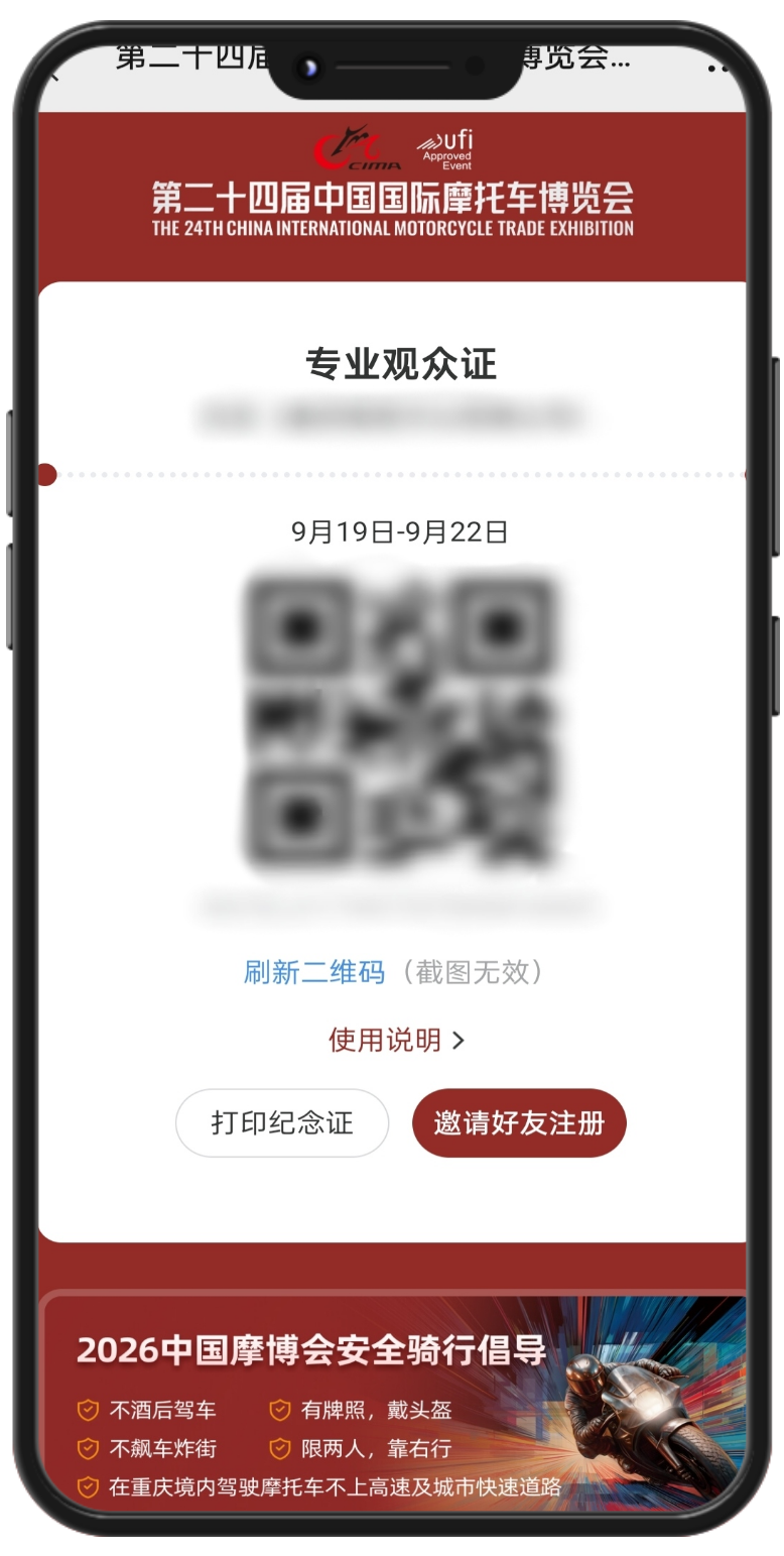 专业观众需实名注册,全展期内仅限本人使用。核销时系统将验证身份信息,非注册本人将谢绝入场。展期内可进入展馆3次。限摩托车行业从业人员使用(摩托车/电动车制造商;摩托车/电动车国内代理商/经销商;汽车/摩托车/电动车部件(配件)制造商;汽车/摩托车/电动车部件(配件)经销商;骑行服饰装备制造商;骑行服饰装备国内代理商/经销商;通用机械制造商;通用机械代理商/经销商;车相关进出口销售/贸易公司;车相关维修部/维修店;设计公司、技术研发机构;汽车/摩托车服务机构(工业园区/安驾/平台/物流/骑行服务商)。