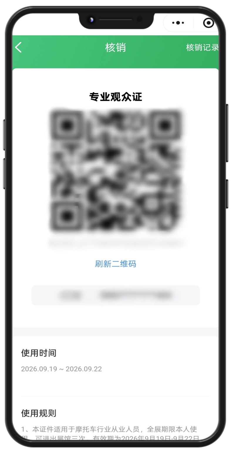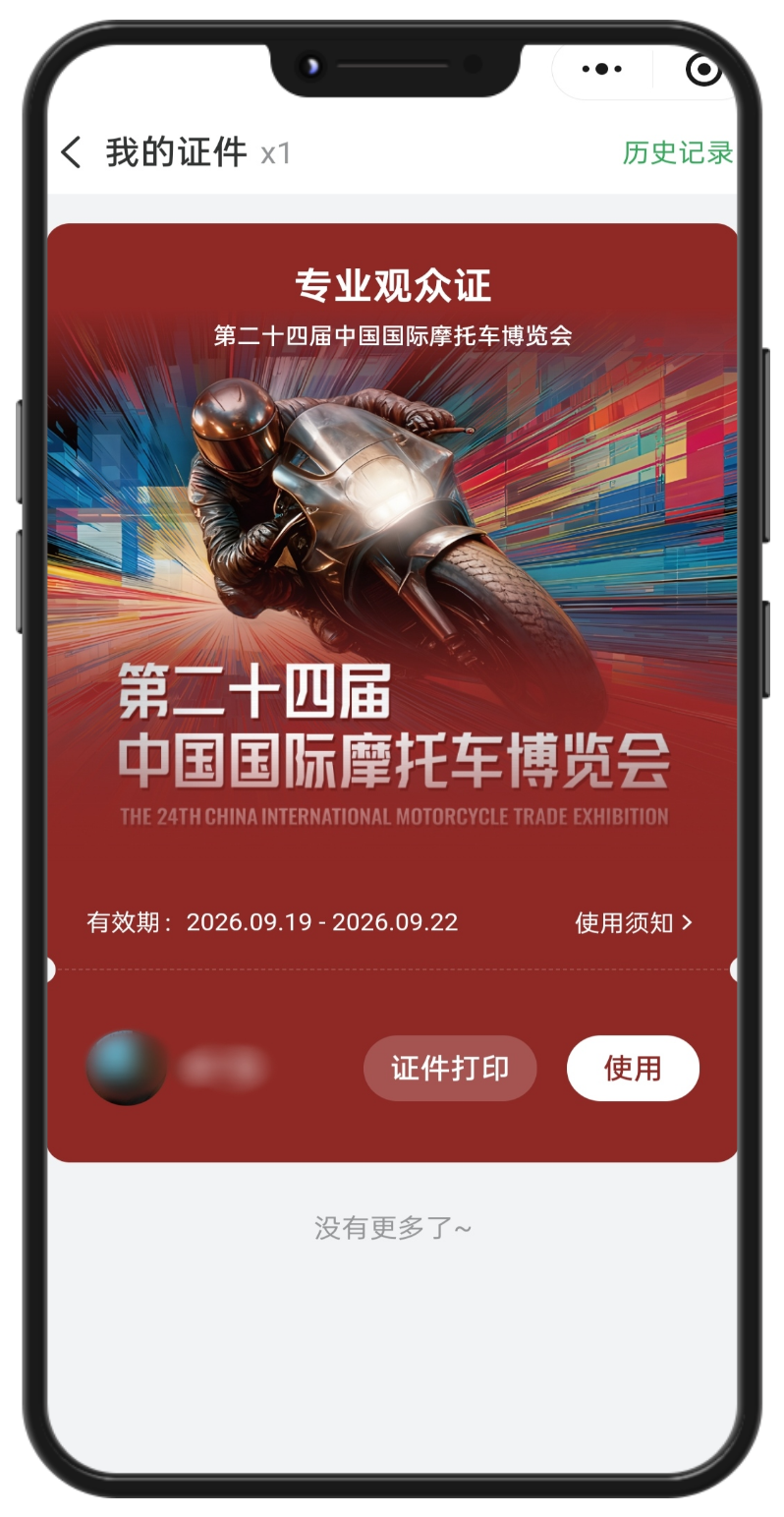 微信关注公众号【中国摩博会】或【骑摩托】,或搜索小程序【中国摩博会】,点击“我的票证”(小程序为“我的”)--“我的证件”--“使用”,打开动态二维码--扫码通过门禁。