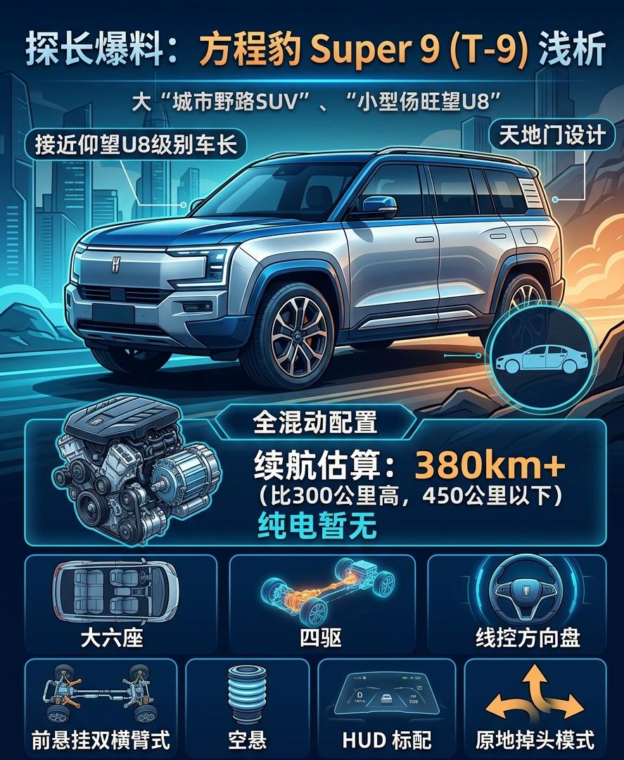 这话翻译一下就是:别拿它去沙漠滚刀锋、别拿它去爬好汉坡。方程豹内部把产品线劈成了两条——豹系列是非承载式车身、三把锁、云辇-P,那是真硬核;钛系列是承载式车身、第五代DM混动,主打城市和家庭。钛9走的正是后一条路。