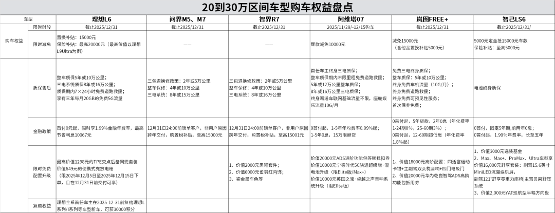 今天的中国车市,竞争最激烈,讨论最热门,最难下决定的,基本就在2030万价格区间了。因为这个市场车型太多,置换需求也最为浓烈。队长就总结了几款热门车型,做了一个年底购车权益表,我们可以大致对比一下。究竟哪个车企更有诚意?更值得买?