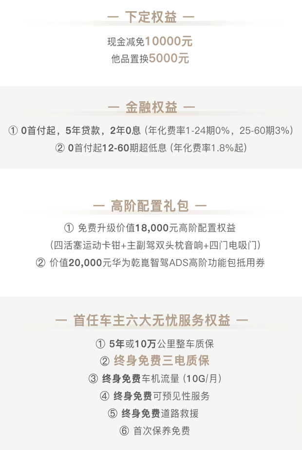 通过这个表,就能看到,像问界M5M7,主要是兜底了一个购置税减免权益,价格上实实在在的优惠,就不多了。智界R7呢?也差不多,但额外赠送了一个黑曜套件、雀羽红内饰。不过,这两个福利,智界R7发布后,就一直都有,队长预计会延续到2026年以后。