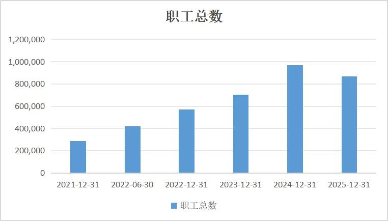 细心的人在对比比亚迪去年和前年财报数据的时候,就会发现在2025年其公司员工已经从前年的97万多人,下降到了87万多人。