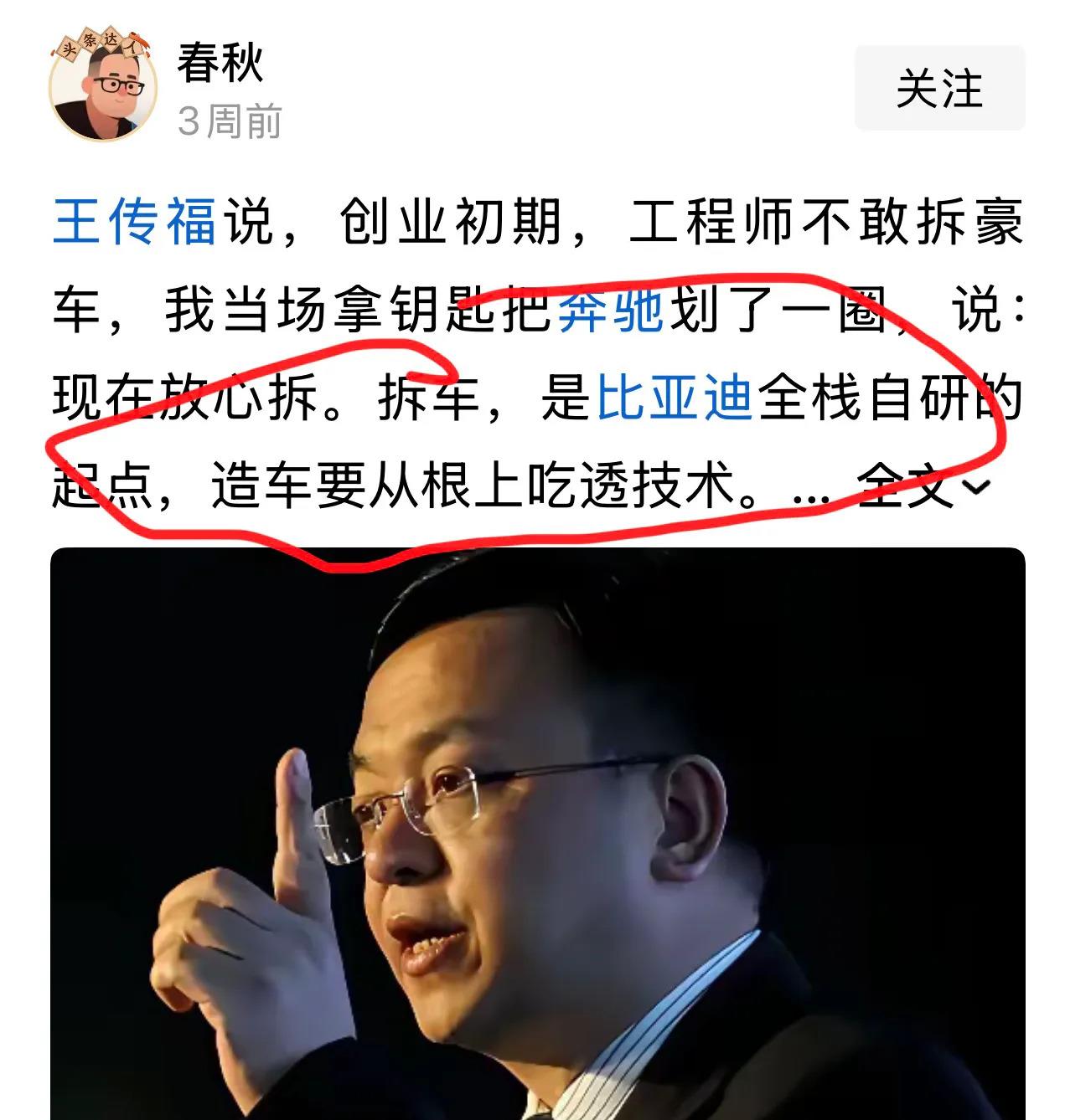 我觉得,真正可怕的不是拆车,而是一辈子只会拆车。王传福用二十年证明了:拆车是“读万卷书”,自研才是“行万里路”。