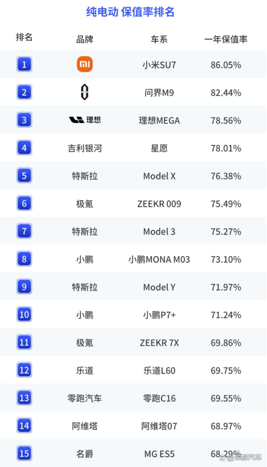 在纯电动车保值率排名中,小米 SU7 以一年保值率 86.05% 位居榜首。紧随其后的是问界 M9 与理想 MEGA,保值率分别为 82.44% 与 78.56%。SU7的畅销以及新车的排队交付,也让它的二手车保值率变高。问界M9不用多说,作为50万级车型,一直热销,保值率自然不错。而理想MEGA首先是车价比较贵,购置税较高,产品力很强,准新车的关注度高,二手车价格就坚挺。
