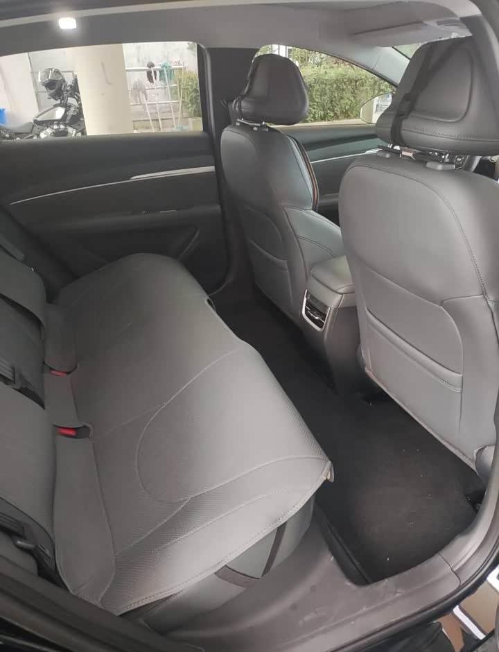 我选的是黑武士配色,真的是越看越喜欢!🖤这黑色车漆不是那种廉价的哑光黑,而是带点光泽的金属黑,洗完车擦干后,在太阳下特别有质感,不会泛白。隐藏式门把手关起来的时候,车身线条特别流畅,加上熏黑的轮毂和黑色后视镜,整个车看起来特别运动。不过黑色就是容易粘灰,停两天车身上就有一层灰,得经常洗车。🧼内饰我觉得简约又干净,中控和车门上半部分都是软包,摸起来软软的。中控屏幕反应很快,点进去切换界面一点都不卡顿。储物空间也够大,扶手箱能放下我的折叠伞、充电宝还有几包纸巾,前排杯架能放500ml的保温杯,还有限位器,杯子不会晃来晃去。最贴心的是副驾化妆镜还带灯,还有氛围灯,晚上开夜路的时候,调个暖黄色,不会刺眼,还能烘托气氛。💡