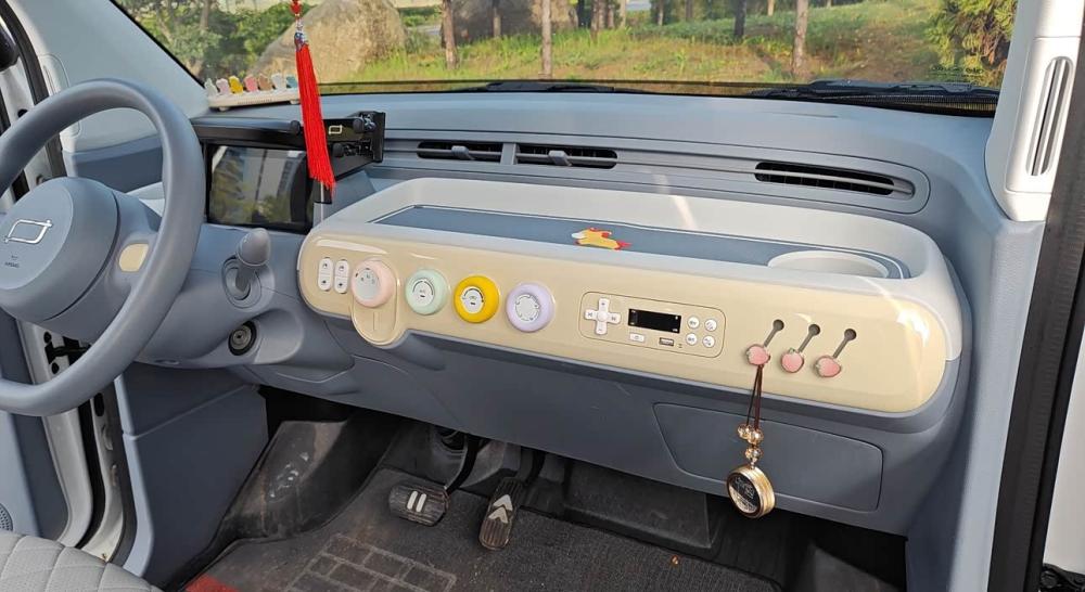 这车外观走可爱风,我选的印象蓝配色特别清爽,不张扬也不沉闷,看着很舒服。而且这个颜色挺耐脏的,平时就市区通勤,车身沾点灰不明显,不用老洗车,省了不少时间和精力。内饰我自己加了点小装饰,像放了个卡通防滑垫、挂了串小挂饰,整体氛围更温馨了。车里的置物空间也够用,门板槽能放下保温杯和折叠伞,中控下面的储物格放手机、钥匙很方便,日常用的东西都有地方放🥰。